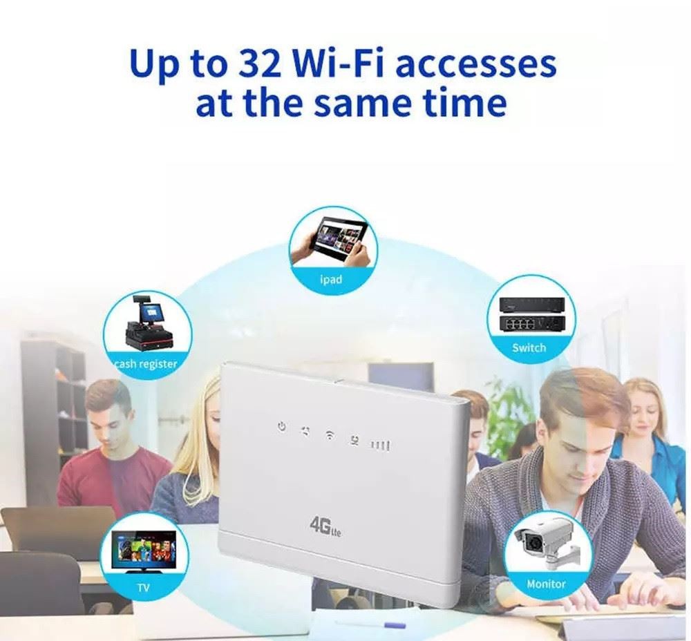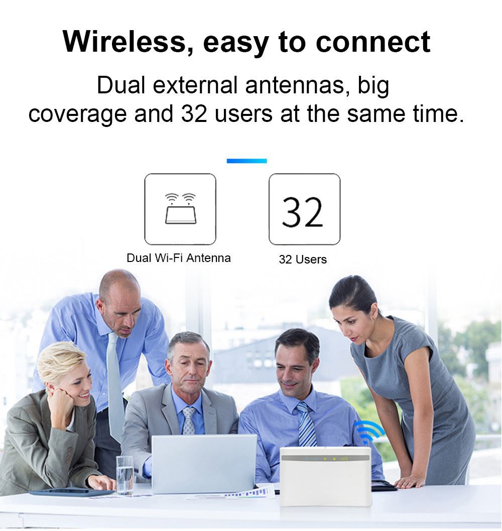 Mae hwn yn llwybrydd CPE dan do LTE datblygedig iawn. Fe'i cynlluniwyd i ddiwallu data integredig ac anghenion mynediad Wi-Fi ar gyfer defnyddwyr preswyl, busnes a menter. (yn gallu cysylltu ag antenâu allanol cysylltydd SMA !) 150M cyflymder uchel, LTE FDD: DL/UL 150M/ 50 Mbps (Cat 4). Trosglwyddo 4G i Wi-Fi, Dim angen Mynediad band eang, mewnosod cerdyn sim , plwg a chwarae. Mae WiFi yn cynnwys fflatiau a thŷ cyfan, yn mwynhau rhyngrwyd cyflym ym mhobman. Hawdd cysylltu, antenâu allanol deuol, darllediadau mawr a 32 o ddefnyddwyr ar yr un pryd.