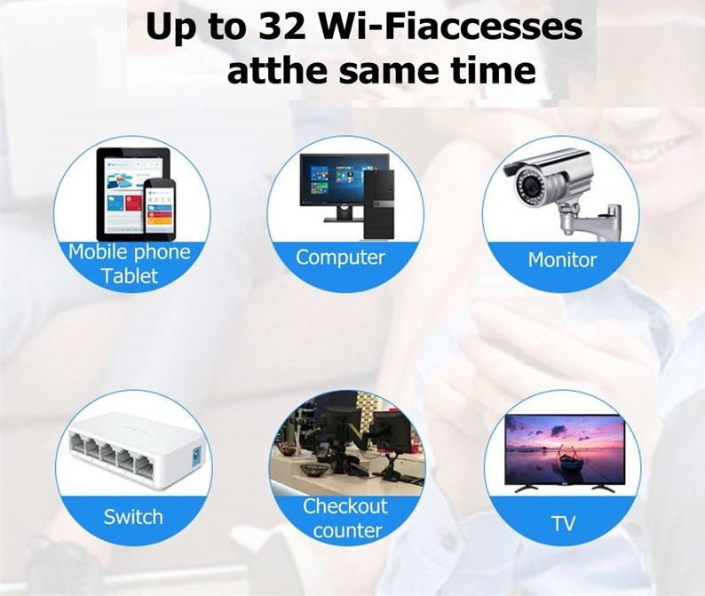 Hyd at 32 o fynediadau WiFi ar yr un pryd. Er bod y llwybrydd 4G yn trosglwyddo WiFi, gall hefyd gysylltu cyfrifiaduron, monitorau, switshis, cofrestri arian parod, setiau teledu ac offer arall gyda cheblau rhwydwaith ar yr un pryd.
